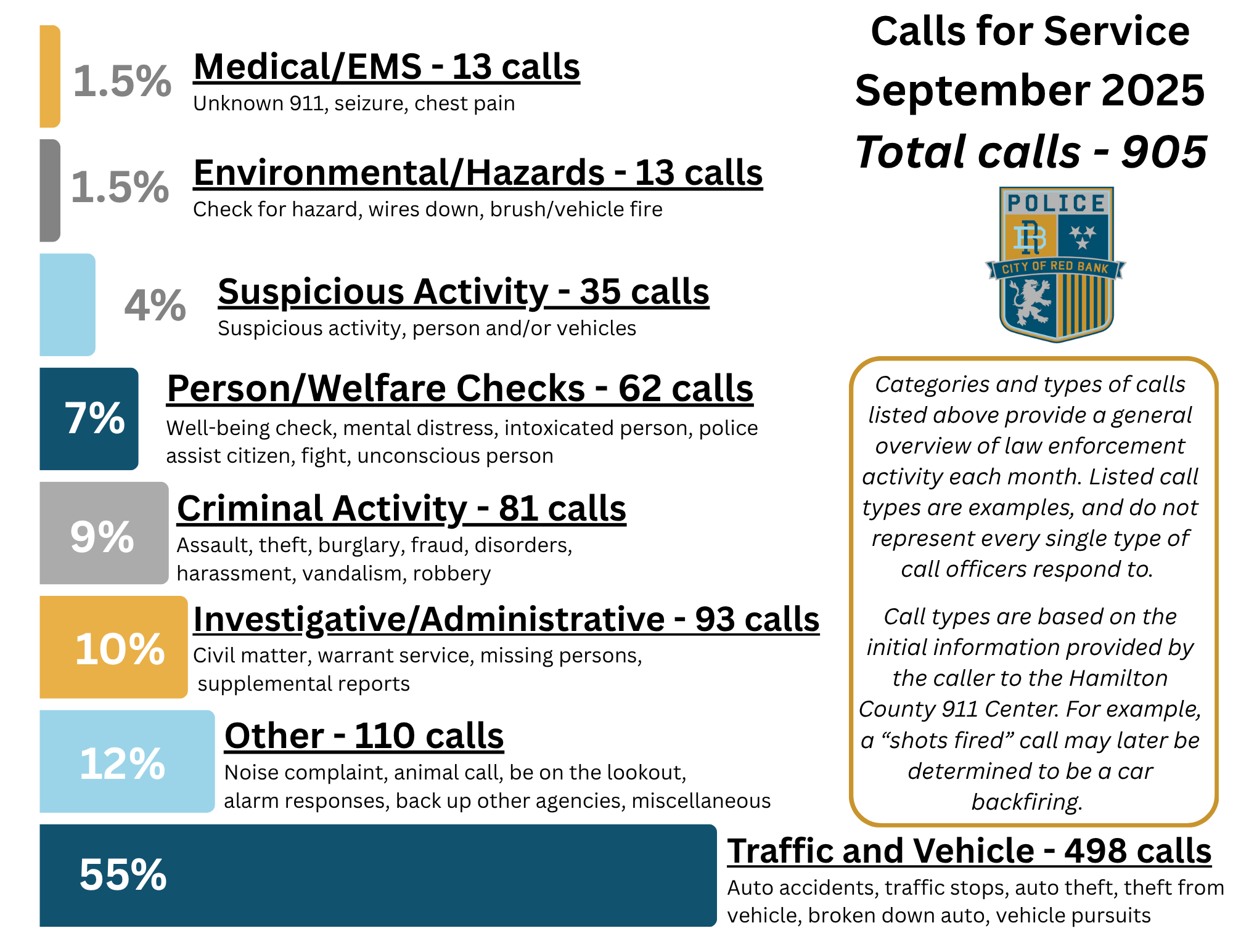 The Hamilton County 911 Dispatch Center provides dispatch services for Red Bank. From traffic stops to emergency responses, welfare checks to criminal investigations- Red Bank officers respond to a wide variety of calls throughout the month.
